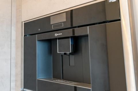 Integrated appliances include Neff coffee machine, double oven, microwave, induction hob, double-height fridge and freezer, dishwasher, washing machine and two wine fridges.