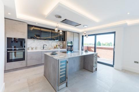 The ceiling is fitted with elegant, double set of pendant lights plus a shadow box, creating a soft light above the island unit, perfect for socialising. This also conceals the extractor fan. Added spotlights and under-counter lights brighten up work areas.